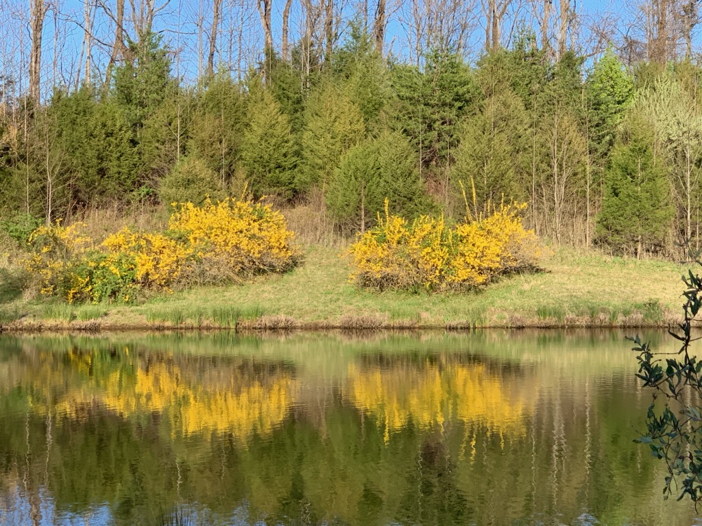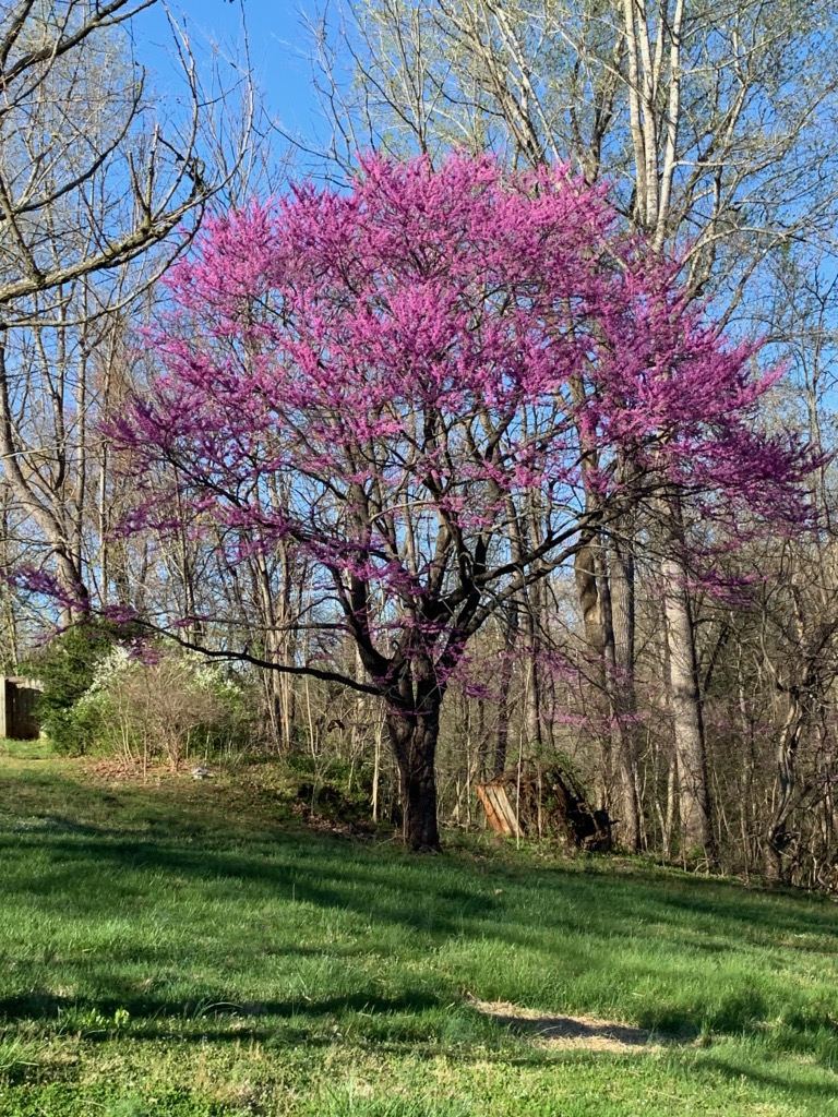 Scrabble, Virginia — My neighbor on the farm across the road and I had a conversation on the shore of his pond yesterday. We kept a safe distance from each other, but enjoyed sitting in the warm sun together and comparing notes, including on the rate at which various trees and shrubs have bloomed this Spring. Some of his forsythia were just beginning to bloom, while on the other side of the pond, the yellow flowers had all fallen off the forsythia and the trees were turning green. “Being out here every day this month, “ he said “I have for the first time watched the full blossoming cycle of the red bud trees. It’s fascinating to watch the emergence as they move from tiny growths on the branches to full blown vibrant arrays of pinks and reds.”