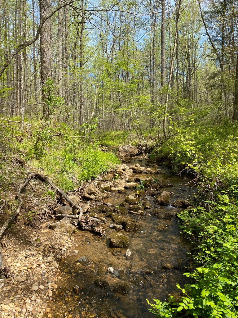 For the last six weeks, this natural arboretum has been moving in stages from buds, to first leaves, and now going into full foliage. The many shades of green, along with the spectrum of flowerings, have provided an ever-changing palette throughout the first half of Spring. During much of this time, the density of leaves has been thin enough that on hikes (or with a small personal drone) one could see much farther than is the case later in the Spring and throughout the Summer. The absence of thick underbrush in early Spring has also allowed a hiker to see more of the protruding rock formations, creeks, and contours that later will be camouflaged by thorn bushes, ferns, and other under growth.